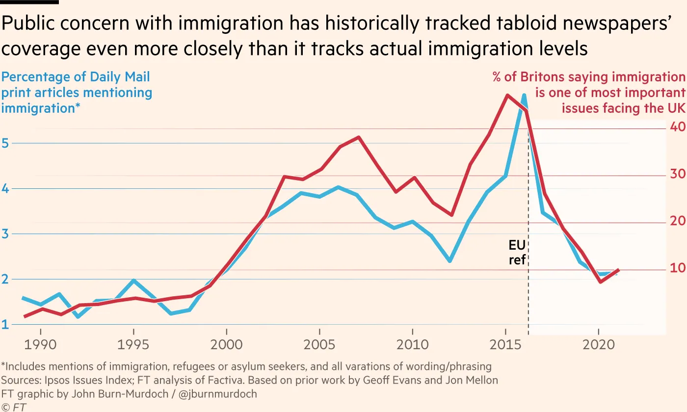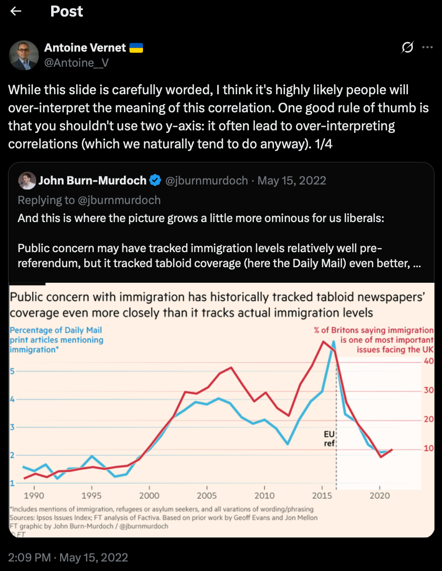 A particularly effective way of making us jump to conclusions is to show us data about two measures over time with two different y-axes for each time series (this tweet is an example, here is why I think it is not very convincing).