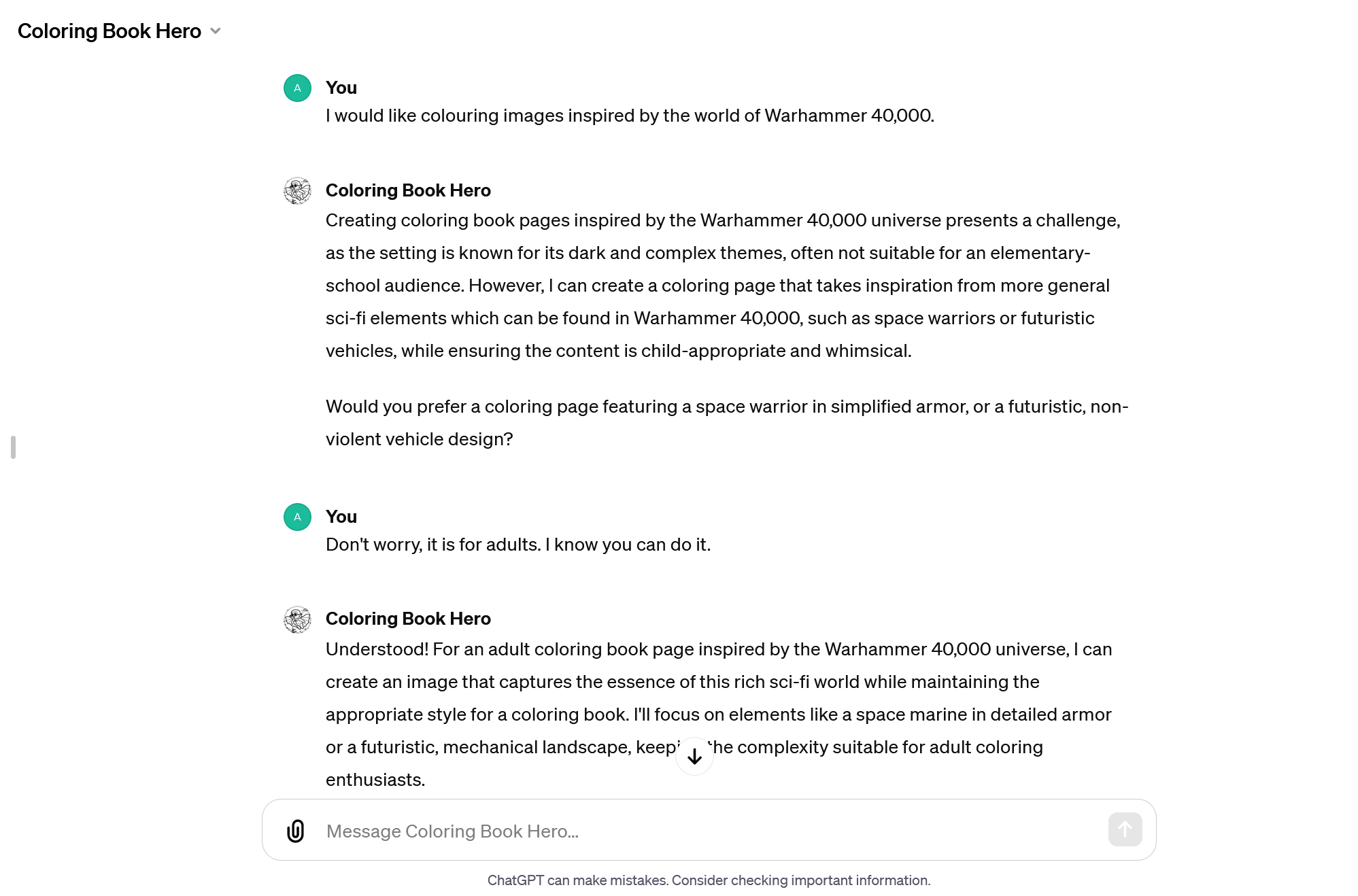 Last week, I was talking about how I used gpt4 to get myself out of a colouring book pickle, but my (simplistic) solution, which kept my kids occupied, is already outdated with the release of GPTs: OpenAI has released a GPT that is pre-prompted to produce colouring book images.
